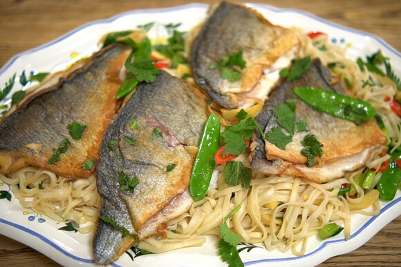 Любая белая рыба, лапша, стручковый горошек или фасоль — базовые ингредиенты могут показаться слишком простыми и неинтересными. Но стоит ввести пестрые дополнения, как угощение заиграет новыми красками. В этом рецепте роль дерзких акцентов досталась чили, имбирю, чесноку и зелени (луку, кинзе и мяте).