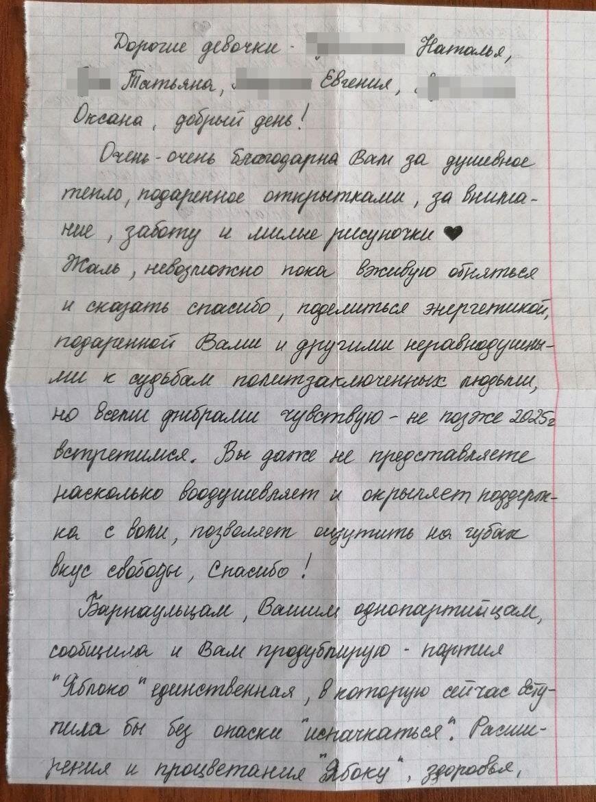 Мария Пономаренко ответила на наши письма и открытки, отправленные ей в один из дней писем, что проходят в офисах «Яблока» ежемесячно в компании единомышленников. «… партия «Яблоко» единственная, в которую сейчас вступила бы без опаски "испачкаться" … Важно верить в перемены и не сдаваться ни в коем случае, свет сильнее тьмы – аксиома» — делится своими мыслями барнаульская журналистка. Напомним, в феврале 2023 года Мария приговорена к шести годам тюрьмы за распространение "фейков" об армии России, которыми следствие считает репост в телеграме публикации о событиях в Украине. Приходите к нам на дни солидарности с политзаключенными, за анонсами этих мероприятий следите в пабликах соцсетей Новосибирского «Яблока».