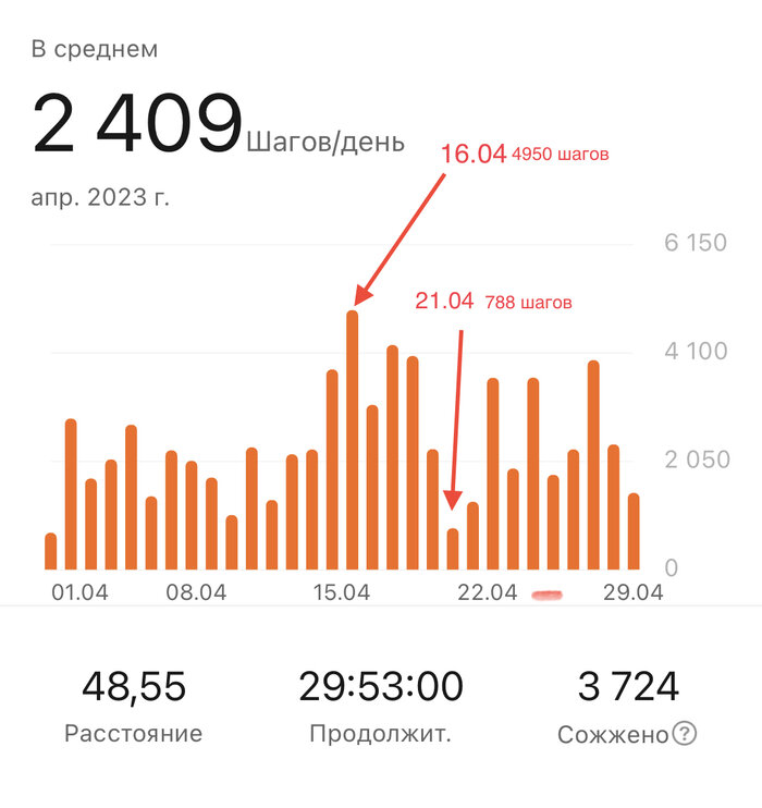 Первый мой пост был 16 апреля. Результат по весу: изменение от 87.6 до 83.8. Хотелось бы больше, но большую часть месяца мне была запрещена всякая физическая активность, а сейчас её всячески рекомендуют ограничивать и с натяжкой разрешили ходить. Но и с этим теперь проблемы - с временем плохо, работы хватает, муж попал в больницу, и надежды на вечерний моцион после отбоя ребенка растворились в туманном будущем. Таким образом результат 3, 8 кг за 33 дня был достигнут только ограничением в питании. Голодать нельзя тоже по медицинским показаниям. Срывы были и не раз, через них я просто перешагиваю и иду дальше. Месяц был нервным, а из тех кто заедают стресс. Мой психотерапевт говорит, что среди самоубийц, больше тех, кто в стрессовой ситуации теряет аппетит. Сон СРЕДНЕМ в этот период неплохой. Хотя были и трудные ночи. Средний «проход»за прошедшие 33 дня равны 3000 шагов в день. Да я не хожу на работу, ни гуляю с ребенком по будням, да и по выходным у нас прогулки так себе. На графике видно, что в первый день (16.04) реализации плана я прошла 4950, и далее старалась ходить больше чем обычно. А затем мне стало нехорошо, но я пыталась выхаживать установленную норму, 20 апреля я получила диагноз, рекомендации по снижению физической активности и 21.04 уже прошла 788 шагов.