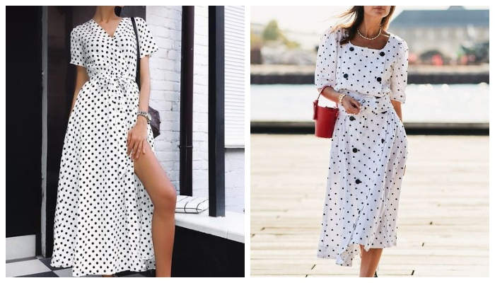 Платье в горошек стилисты уже давно относят в список базы, которая обязательно должна присутствовать в гардеробе у каждой современной модницы. В этот раз мы с вами будем рассматривать головокружительные модели платьев, которые украсят собой дам самого разного возрастного диапазона. Платье для торжественных мероприятий — это модель с асимметричным кроем, воздушными воланами, а также вырезами. Гуру моды утверждают, что длина макси является самой идеальной для праздничных образов. Перед вами наглядный пример женственного платья с открытыми плечами в крупный горошек, которое здорово смотрится с модными плетеными сумками, а также летней обувью на плоской подошве. Для жаркого времени года идеально подойдет платье мини на тонких бретельках с эффектными чашечками. К данному убранству можно подобрать модную плетеную сумку, а также босоножки на высокой танкетке. Все также на пике популярности остаются платья мини на запах, украшенные мелким принтом "горошек". Платье данного фасона идеально скрое