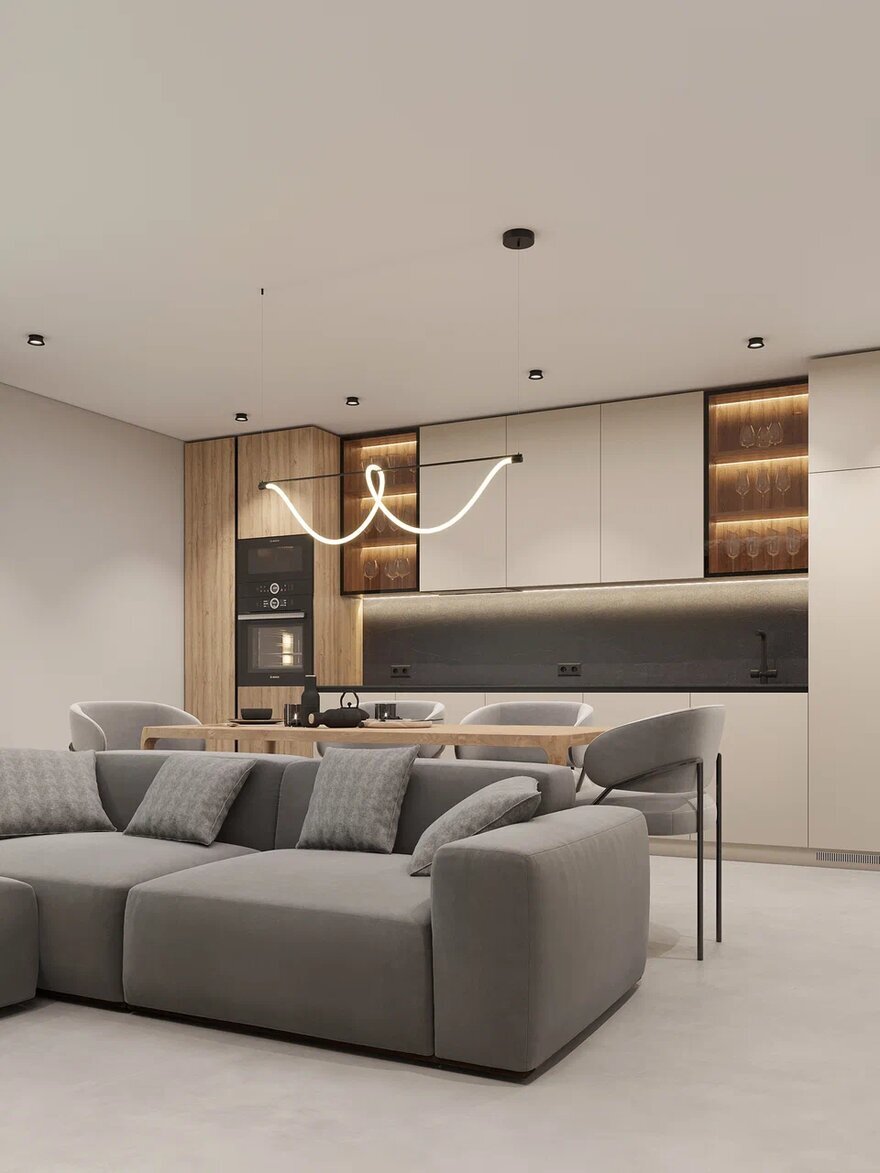 Да, дом площадью 118 кв.м. действительно считается небольшим, однако он идеально подходит для проживания молодой семьи с ребенком. Перед началом работ над дизайн-проектом провели небольшую перепланировку, чтобы улучшить функционал и эргономику дома: - возвели дополнительные стены на крыльце и перенесли входную дверь, в результате вместо открытого крыльца получилась прихожая; - демонтировали стены помещения котельной и оконный блок; - демонтировали часть межэтажного перекрытия для установки лестницы; - расширили оконный проем на втором этаже. А теперь рассмотрим непосредственно дизайн дома и начнем с прихожей. Прихожая нас встречает современным интерьером в серых тонах, который не перегружен оттенками, но при этом не выглядит скучным. Удобный пуф, обувница, большое зеркало от пола до потолка со светодиодной подсветкой и оригинальные потолочные споты черного цвета с плафонами из матового белого стекла, создают уютный и стильный интерьер. Из прихожей мы попадаем в коридор. За счет окна