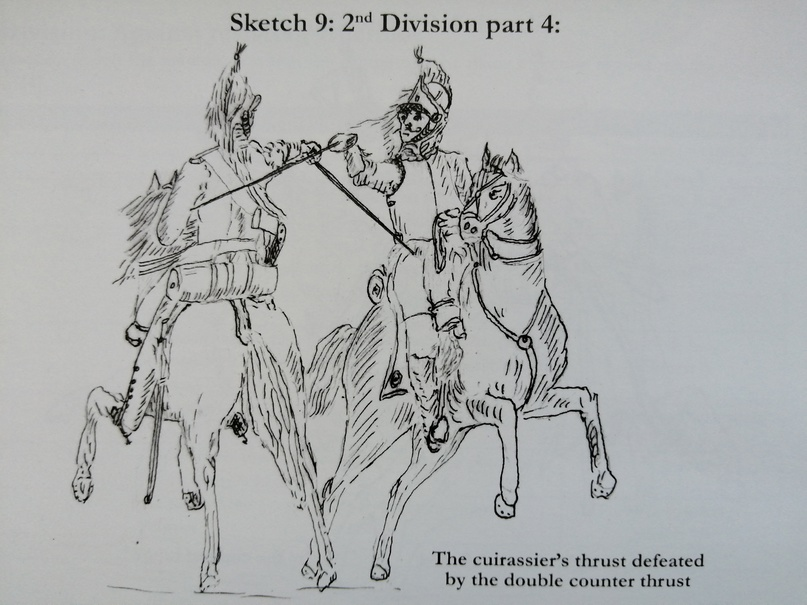 Кирасиры обычно встречают атаку на месте, с остриями своих мечей, направленными на их оппонентов. Для противодействия преимуществам их оборонительного вооружения, драгун должен воспользоваться мгновенным контролем оказываемого ими давления, для того, чтобы справится с их уколом посредством двойного контр[-укола]. Он выполняется из «атаки» и хорошо приспособлен к использованию в атаке [charge] на неприятеля подобного рода. Он обладает всеми преимуществами превосходной защиты и нападения (Набросок 9 с. 22), и само то действие, которым он отклоняет выпад [кирасира], с неизбежностью направляет его [драгуна] острие в пах или бок неприятеля.