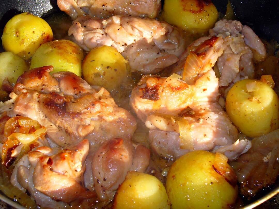 Курица со шпинатом. Простое, вкусное, бюджетное блюдо для домашнего стола. Сейчас прям подробно - подробно напишу. Ибо сын отпочковался, живет сам и кулинарит сам, так что чтоб было что взять на вооружение. Что надо - Куриные окорочка без кости - 3 штуки, Лук репчатый - 1 штука, Картофель молодой - примерно 10 штук, небольших, Приправа с сушеными кореньями - 1 чайная ложка, Масло растительное ( оливковое) - 2 - 3 ст ложки, Соль, свежемолотый черный перец, Шпинат свежий - пучок. Что делаем - На сковороде разогреть растительное масло. Выложить куриное мясо, посолить, поперчить и обжарить на среднем огне. В это время, пока курица жарится - Очистить картофель и лук. Картофель оставить целиком, лук нарезать полукольцами. Перевернуть куриное мясо, посолить, поперчить. Сразу добавить лук, картофель. И продолжать обжаривать слегка убавив нагрев и закрыв крышку. Пару раз помешать лук и картошку. Все это дело у нас по времени заняло 15 минут. Теперь - добавляем приправу и воду. Воды - до полов