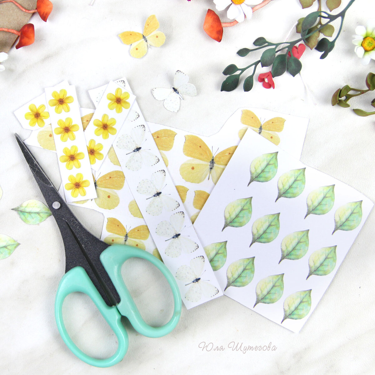 В этой статье подведу итоги о проделанной работе по созданию деталей для лесной открытки👍 Но для начала покажу еще немного декоративных элементов, которые тоже приняли участие в оформлении открыточки. И это плоские элементы (разные картинки и отрисовки). Среди них бабочки, цветики (это картинки из интернета) и мои акварельные листики (их я изначально нарисовала от руки, а потом перевела в электронный вид - при необходимости печатаю на матовой фотобумаге). Кстати, мои отрисовки в электронном виде можно приобрести и для своих творческих работ. Там представлены листики в разных оттенках. Все картинки вырезаю ножничками. Здесь нужно работать очень аккуратно, т.к. картинки достаточно маленькие. Последние детали подготовлены и теперь можно полюбоваться полным набором для создания открыточки 😍 Ну, красота же?)) Более подробно про создание этих деталей я рассказывала в предыдущих статьях (оставлю на них ссылки). Кроме декоративных элементов понадобятся еще фоновые элементы - подложки (им