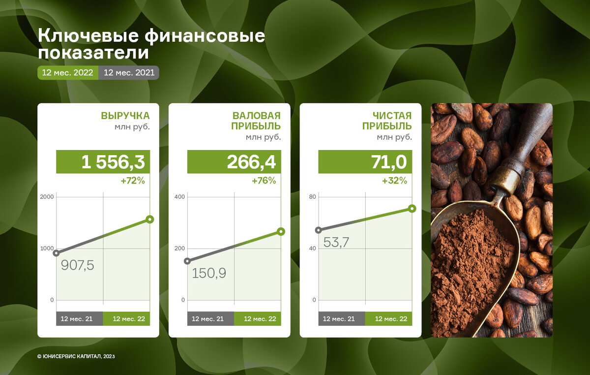 Полученные инвестиции были направлены на пополнение оборотных средств, в первую очередь, запасов, размер которых на 31.12.2022 составил 215,5 млн руб., что выше значения на 31.12.2021 на 43%. Запасы какао-порошка, лимонной кислоты, кокосовой стружки, пищевых ароматизаторов и прочих ингредиентов составляют 46,3% активов баланса.