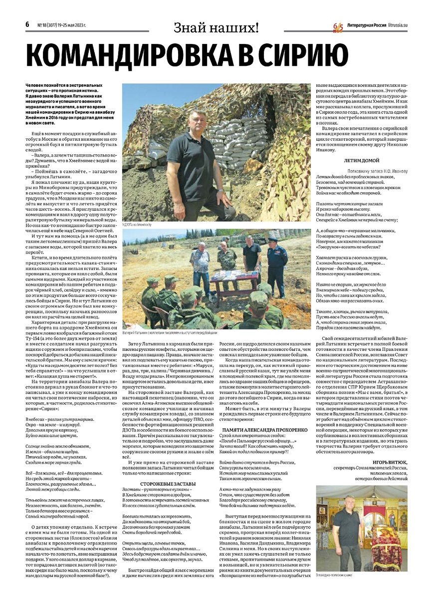 Человек познаётся в экстремальных ситуациях, – это прописная истина. Я давно знаю Валерия Латынина как незаурядного и успешного военного журналиста и писателя, а вот во время нашей командировки в Сирию на авиабазу Хмеймим в 2016-м году он предстал для меня в новом свете.