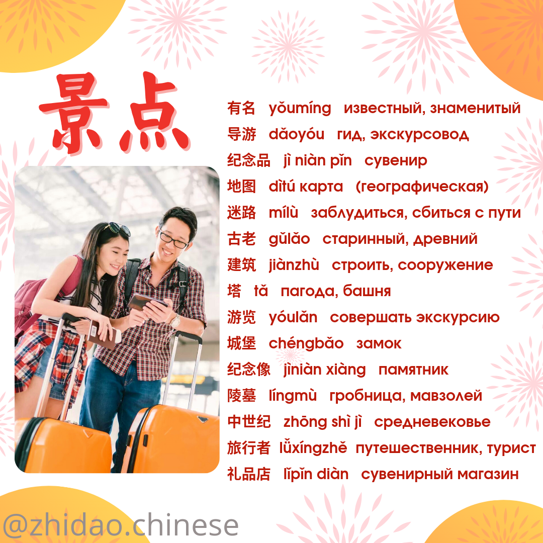 #zhidao_подборка_слов Ставьте лайк, пишите "буду учить", и мы отправим подбор карточек Quizlet для изучения новых слов 💪🏻 В Quizlet вы также можете услышать произношение каждого слова! Тема: Достопримечательности (景点 jǐngdiǎn) 🧳 🔸有名 yǒumíng известный, знаменитый 🔸导游 dǎoyóu гид, экскурсовод 🔸纪念品 jì niàn pǐn сувенир, подарок (на память 🔸地图 dìtú карта (географическая) 🔸迷路 mílù заблудиться, сбиться с пути 🔸古老 gǔlǎo старинный, древний 🔸建筑 jiànzhù строить, сооружение, здание 🔸塔 tǎ пагода, башня 🔸游览 yóulǎn совершать экскурсию, осматривать (достопримечательности) 🔸城堡 chéngbǎo замок, бастион, укрепление 🔸纪念像 jìniàn xiàng памятник 🔸陵墓 língmù гробница, усыпальница, мавзолей 🔸中世纪 zhōng shì jì средневековье, средние века 🔸旅行者 lǚxíngzhě путешественник, турист 🔸礼品店 lǐpǐn diàn сувенирный магазин 📚 Хотите, чтобы Вы или Ваш ребенок заговорили на китайском? Напишите нам для записи на групповые / индивидуальные занятия! 🎓