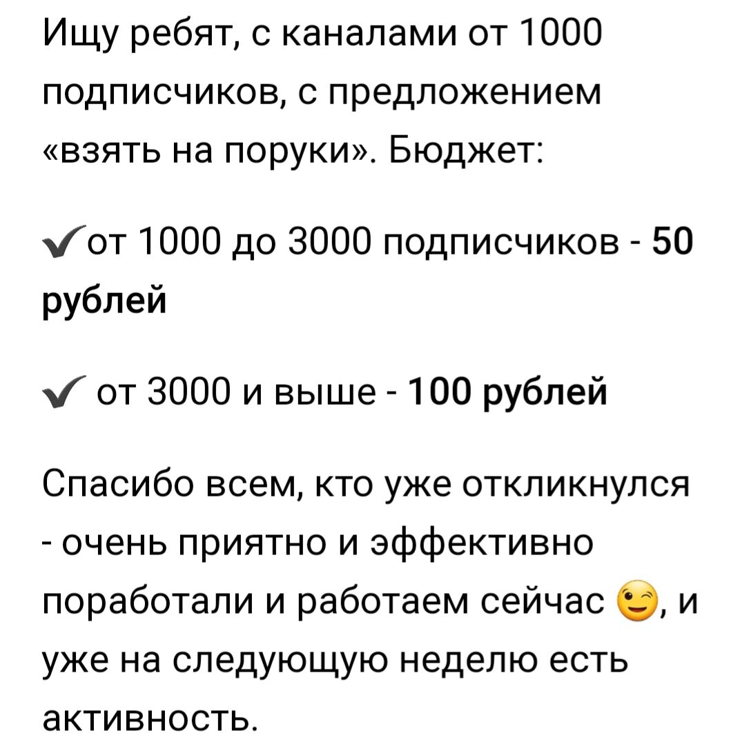 Друзья, тема денег на Дзен звучит постоянно. У подавляющего числа каналов начисления очень скромные. И если появляется возможность хоть немного эту денежку увеличить, надо воспользоваться, да? Одна из таких возможностей выпускать на Дзен рекламные публикации. Но где взять рекламодателя готового заплатить? Да всё здесь же, на Дзен, просто посмотрите кто и что из друзей публикуют. Сегодня утром попалось мне интереснейшее предложение, по рекламе. Я и подумал. канал небольшой, мало кто увидит. А я расскажу, о предложении, может быть кому и пригодится. Идея продвижения и раскрутки канала интересная. И мне очень любопытно понаблюдать. Кстати, Друзья, если ваш канал еще не дотянул до 1000 и вы прямо сейчас не можете принять участие, надо только подождать. Вы ведь растете. а значит, придет и ваше время) Подписаться не помешает, что бы свежие объявления отслеживать Ссылка на статью Я, вне бюджета, если что, бесплатно написал. Спасибо что дочитали до конца. Удачи!!!