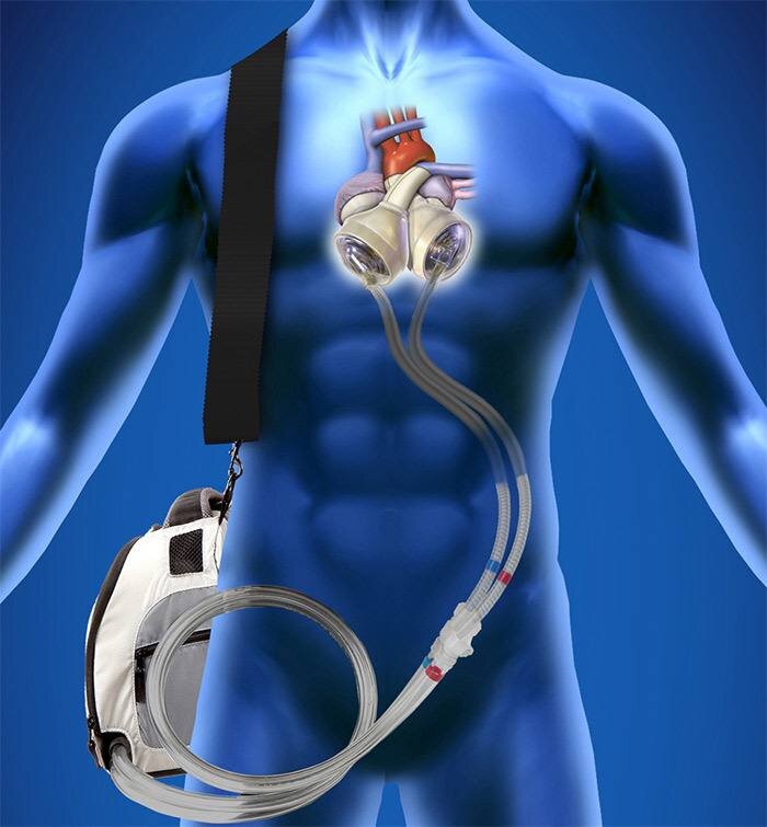 У Стэна Ларкина диагностировали кардиомиопатию - поражение миокарда. ⭕️Найти донора сердца - дело нелегкое, за год в среднем происходит только 5-6 тысяч трансплантаций по всему миру, а в одном только американском списке ожиданиия 121 тыс. человек. ⏱В ожидании сердца Стэну Ларкину установили временное тотальное искусственное сердце и портативный драйвер freedom - переносной сердечный насос, который с помощью сжатого воздуха качает кровь по артериям. Так он провел 555 дней, и, в 2016 ему пересадили человеческое сердце) *Абсолютный рекорд - 1374 дня, это вообще чума То есть у нас 2 компонента - 1️⃣сердце, которое устанавливают на место обычного и фиксируют ко всем отходящим сосудам и 2️⃣насос. 🏋🏻♂️Эта штука весит 6 килограмм 🔌заряжается от сети. 💵Такая система обойдется примерно в 150 тысяч долларов. ⚠️Но, понятное дело, замена временная, а не полноценная: приходится постоянно посещать больницу, а в обычной жизни запрещены почти все физические нагрузки, но вот герою сегодняшнего пост