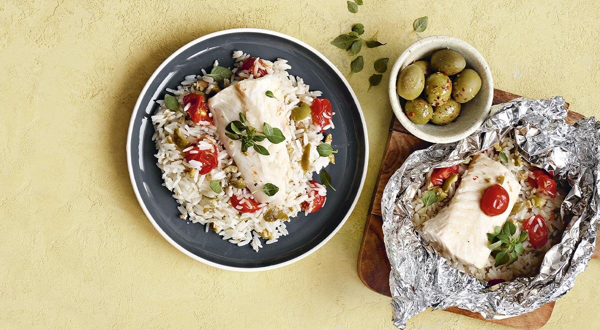 Минимум усилий на ужин: запеченная рыба с рисом и помидорами
