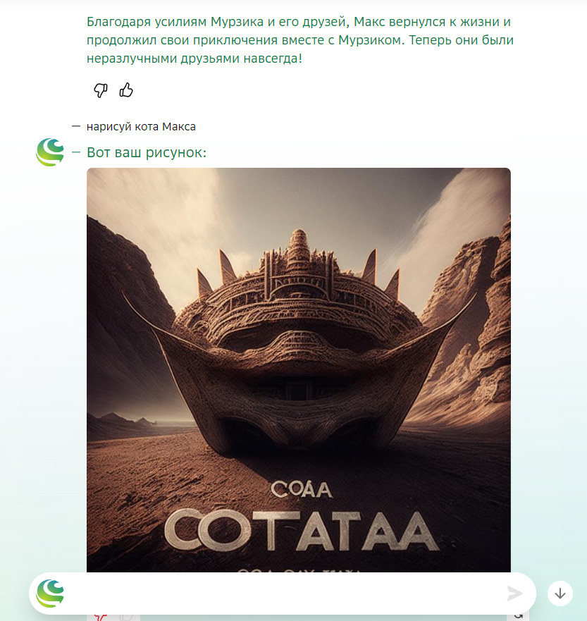 Забавно, в одном из диалогов я попросил гигачат написать сказку про кота-киборга, как в позапрошлом посте, после чего я попросил его сгенерировать этого кота (кота Макса, по контексту разговора). Он меня совсем не понял и сгенерировал что-то странное.
