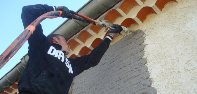 Механизированное нанесение - этот способ более современный и осуществляется при помощи компрессора и хоппер ковша. Насадка (сопло) на хоппер ковш по замерам должна быть в несколько раз больше, чем максимальное зерно в материале. Этот нюанс очень важен и влияет на удобство нанесения материала и на конечный результат.