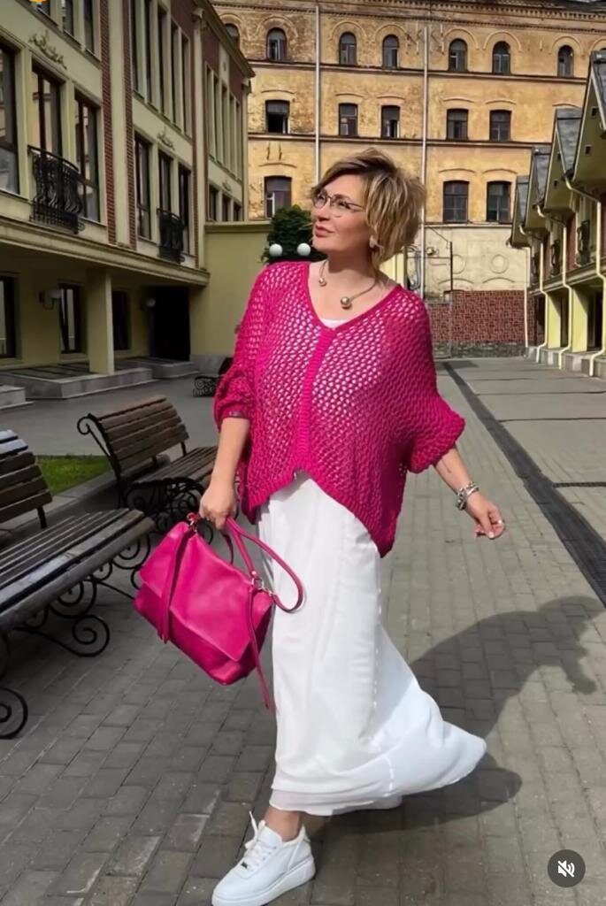 Свитер единого размера, подходит на разные типы фигур, спинка удлиненная. Добавляем к образу сумку в цвет свитера и белые кеды. Такой наряд прекрасно подходит как для города, так и для поездок на моря, на вечернее время когда прохладно. Можно надеть красивые туфли с блестящей пряжкой и тогда образ получится более вечерний и нарядный. Длинное платье макси в черном цвете.