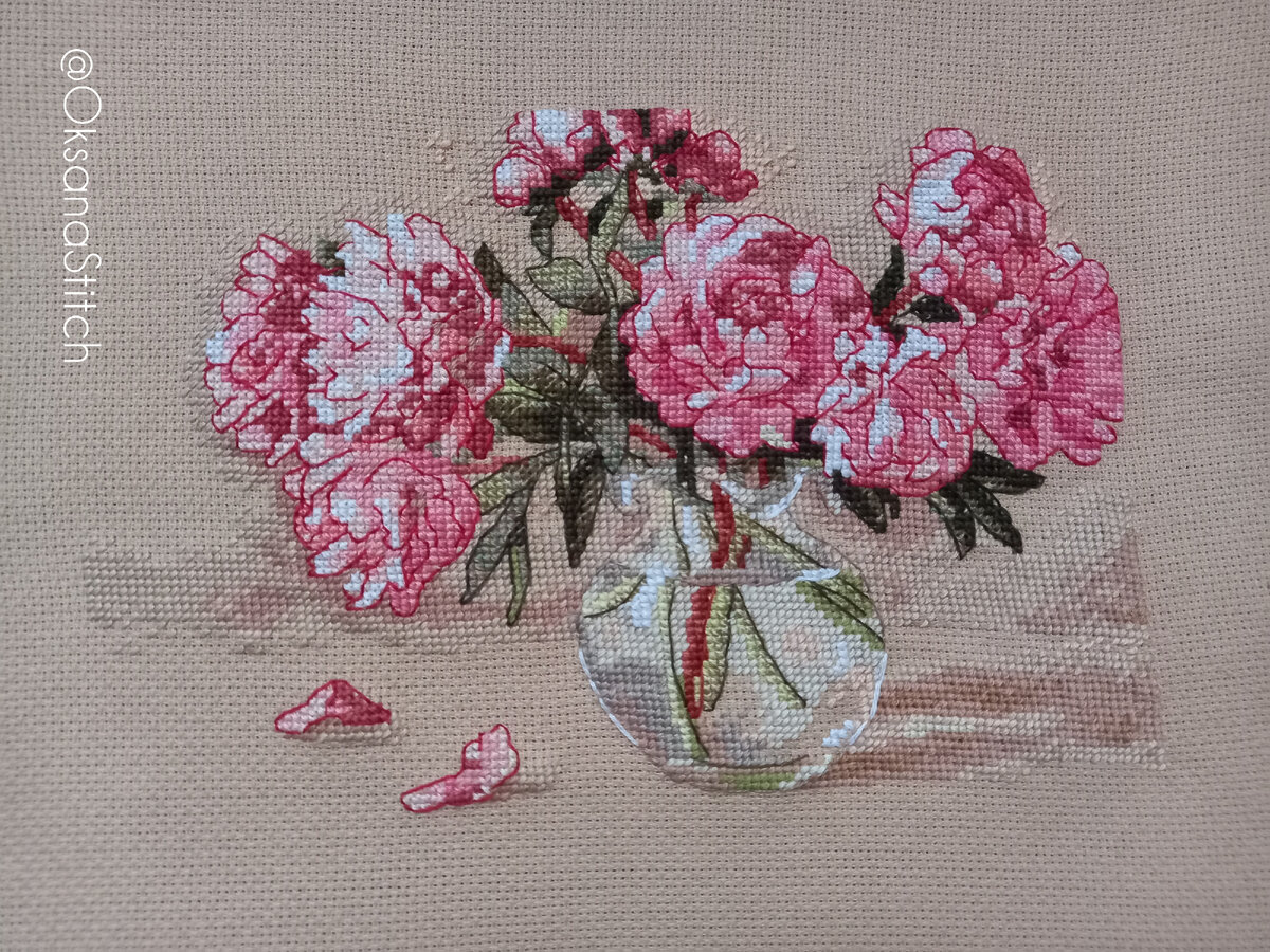 Четвёртый финиш 2023 года, красивый, чветущий. Dimensions Peonies in Vase, вышивала по набору китайской фирмы Amishop. В наборе была канва Аида 18 каунта цвета кофе с молоком, очень похожая на оригинальную канву. Нитки Rosage в наборе - аналог DMC. Очень приятные материалы! Единственный момент, заставивший меня напоследок напрячься, ниток красного оттенка, которым вышивался бэк на самих цветках, хватило с точностью до двухсантиметрового хвостика. Я уж было подумывала отрезать ниточку сантиметров десять из своих запасов. Но все обошлось. И, как видно, отличий с оригиналом нет или они минимальны, если сравнивать работы, вооружившись хорошей оптикой и быть очень пристрастным. Начала вышивать 1 февраля, предвкушая весну, финишировала 19 мая. 22 вышивальных дня. Работа в сочетании моих самых любимых оттенков: розовом и зеленом. Всё прекрасно! Ни добавить, ни убавить. Ещё раз восхищусь мастерству дизайнеров схем фирмы Dimensions! Все продумано до мелочей, до стежка полукреста в тенях... А э