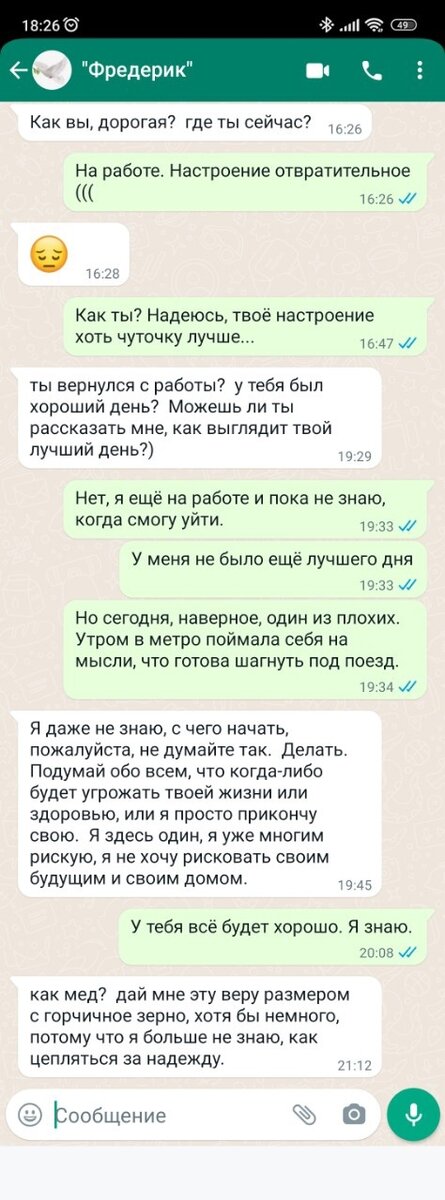 Серия 1, Серия 2, Серия 3, Серия 4, Серия 5, Серия 6, Серия 7, Серия 8, Серия 9 (часть 1), Серия 9 (часть 2), Серия 10. Для ЛЛ: Меня разводит мошенник, а я рассказываю ему небылицы, что отправила ему всё, что у меня есть. Внимание, один из скриншотов содержит кадр, который не рекомендуется видеть слабонервным. Вот, кстати, я-то милому отчитываюсь, как спала и что ела. А он все мои вопросы "Как ты?" игнорирует. И ноет, и ноет, и ноет... Я что-то придумываю, предлагаю, а он ноет. И да, это просто дерьмовый мёд. Ещё раз прошу убрать от экранов детей и слабонервных. Ну, я ему опять вопросы, мол, как ты, как твоя голова?.. Вот тут я серьёзно разозлилась. Запугивать вот такими фото. Ещё и паузу выдерживать. Гадость какая! И сразу так мило про ужин спрашивает. Наутро любимый поднял мне настроение. Давно я так не смеялась) Началось с того, что прислал коротенькое видео, буквально одна секунда: бегущие по грунтовке ноги в кроссовках, по сторонам зелень. Ну, я и спросила: Я вас даже видео прилож