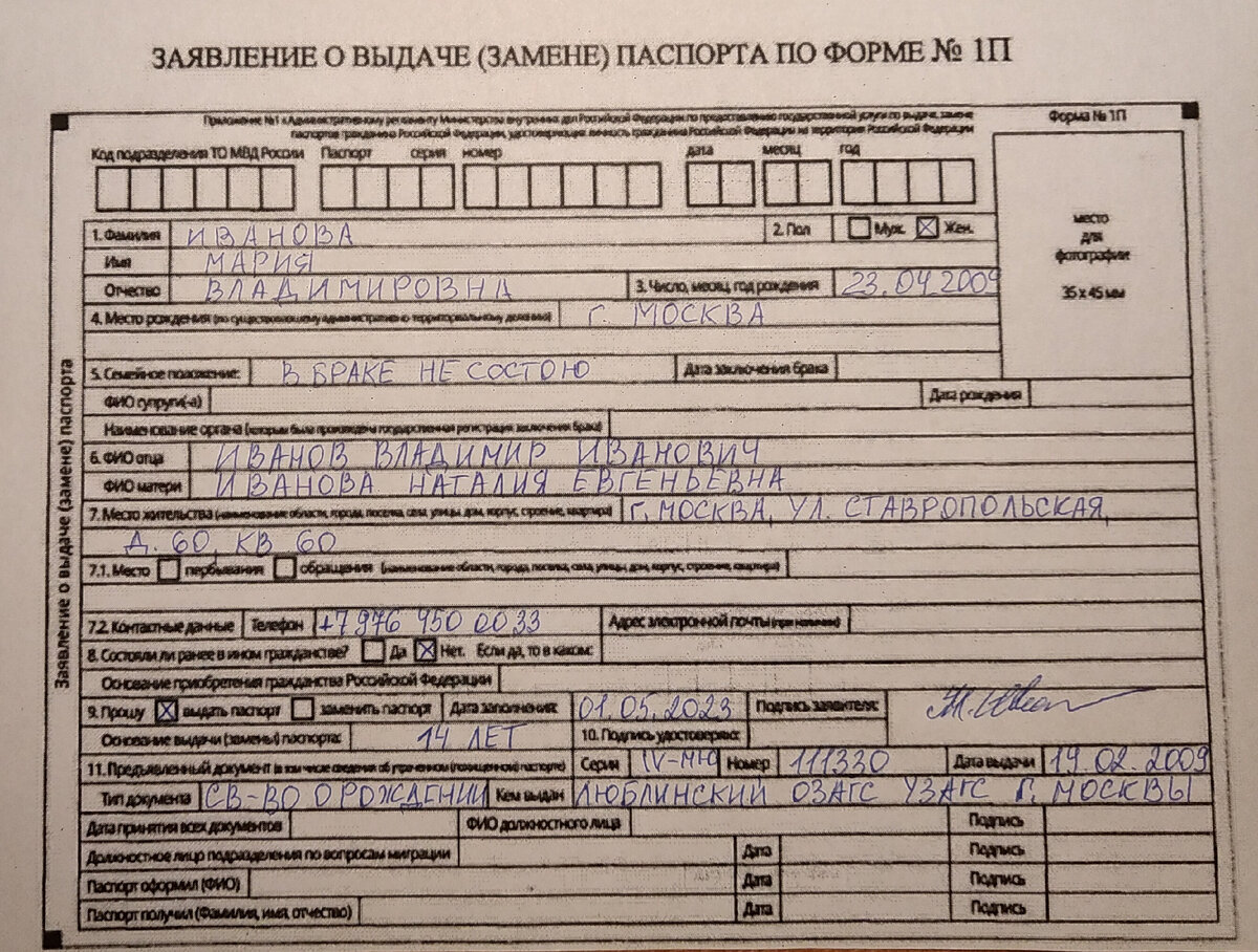 Моей старшей дочке вчера исполнилось 14 лет. Пора получать свой первый паспорт. Если вы думаете, что это так легко, то будете не правы. Я уже прошла все этапы и могу вам рассказать с чего надо "начинать" и куда надо "бежать". Делюсь своим опытом. Первое что надо сделать - это пойти с ребенком в фотоателье и сделать фото на паспорт 35х45. Вам предложат сделать 2 фото или 6 фото. В среднем цена фото 300 рублей. Берите 6 фото, так как у вас попросят на всякий случай 4 фото. Второе, что вы делаете - это опять берете ребенка и чтобы сэкономить время идете в ваш местный МФЦ. Берете заявление о выдаче (замене) паспорта по форме №1П. Вам необходимо заполнить это заявление. Оно заполняется просто, но надо быть внимательным. Есть несколько нюансов, на которые я и наткнулась по своему незнанию. И методом "тыка", запоров одно заявление, я узнала как правильно надо заполнять. Вот, делюсь с вами. 1. Заполнять заявление надо ТОЛЬКО СИНИМИ чернилами и ТОЛЬКО ПЕЧАТНЫМИ, БОЛЬШИМИ БУКВАМИ. 2. НЕЛЬЗЯ Н