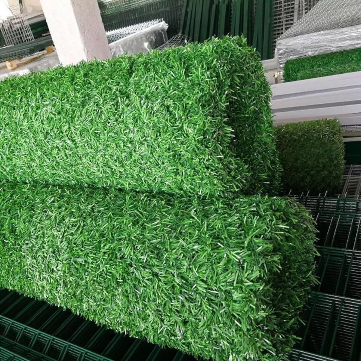 Преимуществом такого забора является то, что с двух сторон он выглядит совершенно одинаково, искусственная зелень не выгорает, не растрёпывается, не меняет цвет в течение 10 лет.