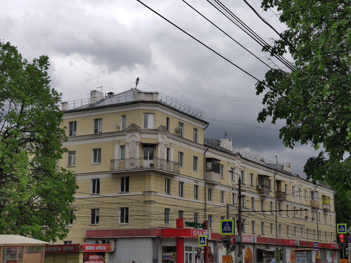 А вот здесь на фасаде уже более сложная лепнина, сочетающая классические венки и вазоны с элементами советской символики - серпом и молотом и пятиконечными звёздами. Это наша история, и мне это нравится.