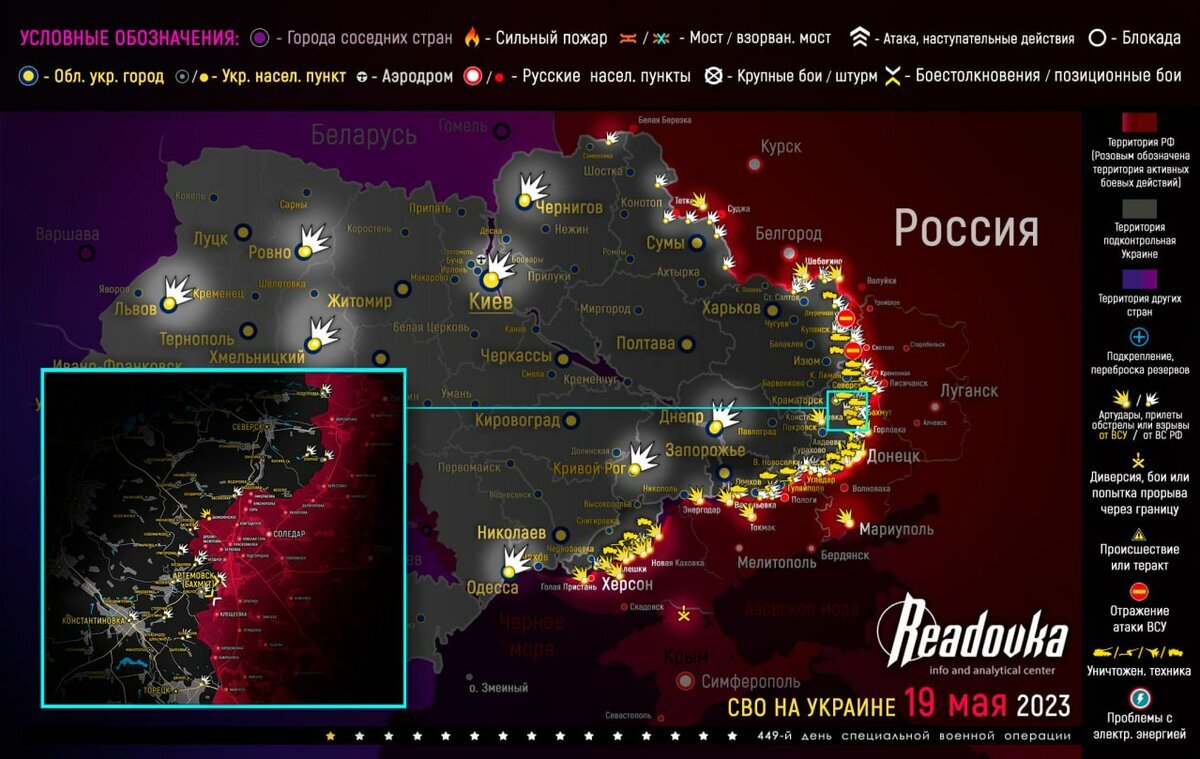 Под контролем ВСУ остались всего 600 кв м. Российские войска продолжают проводить спецоперацию на Украине. Кроме того, ЧВК «Вагнер» Евгения Пригожина за сутки в Артемовске (Бахмут) продвинулись на 500 метров. Карта военных действий и ситуация на фронтах вечером 19 мая: Сватово-Кременное направление ВСУ сумели успешно атаковать в районе Белогоровки. В это же время ВС РФ продвинулись в Серебрянском лесничестве. Также российские военные наступали на позиции боевиков в районах Невского и Макеевки. Артемовское (Бахмутское) направление «Музыкантам» осталось выбить боевиков из района «Самолет» и окраин улицы Чайковского. За сутки «оркестр» продвинулся на 500 метров, под контролем ВСУ осталось 600 квадратных метров территории города. Донецкое направление ВСУ увеличили интенсивность обстрелов российских позиций в Авдеевке и Первомайском, но атакующих действий боевики не предпринимают. Тем временем по вражеским укрепрайонам работает русская авиация, один из прилетов пришелся на коксовый цех №2 А