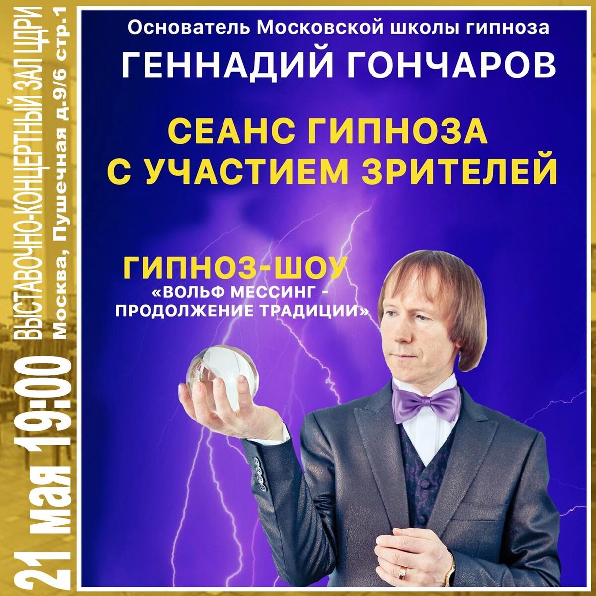 Центрального Дома работников искусств Билеты на сайте: https://cdri.ru/afisha/maj-2023/gipnoz-shou.html или в кассе ЦДРИ: г. Москва, ул. Пушечная 9/6 стр.1