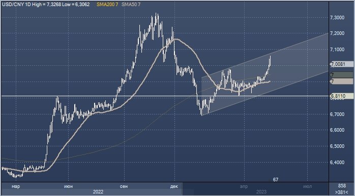 В банке считают, что юань может подешеветь до 7,2 за доллар. График доллар/юаня интервалами в 1 день Citigroup рекомендует сохранять медвежий настрой в отношении китайской валюты. Стратеги банка отмечают, что надежды на ускоренное восстановление экономики Китая после снятия антиковидных мер в значительной степени не оправдались. Citi предполагает, что в течение 3 месяцев курс доллара к юаню может вырасти до 7,2. Разочаровывающие апрельские макроэкономические данные по Китаю подтверждают, что восстановление сектора услуг, вызванное небольшим увеличением активности, не распространяется на экономику в целом. Препятствия для принятия значимых ответных мер в области денежно-кредитной политики, по-видимому, все еще высоки, что означает, что доверие частного сектора остается на низком уровне. Более того, слабость товарного сектора означает, что потенциал Китай импорта из остального мира выглядит ограниченным, что может повлиять на перспективы роста в Европе и развивающихся странах, ставя под