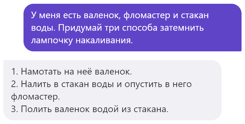 Как видите, с генерацией идей два отечественных искина уже вполне справляются — их, пожалуй, можно было бы даже использовать в реальном деле, если бы не существование более продвинутых конкурентов. При этом, как и следовало ожидать, ответы ЖПТ-4 гораздо качественнее.