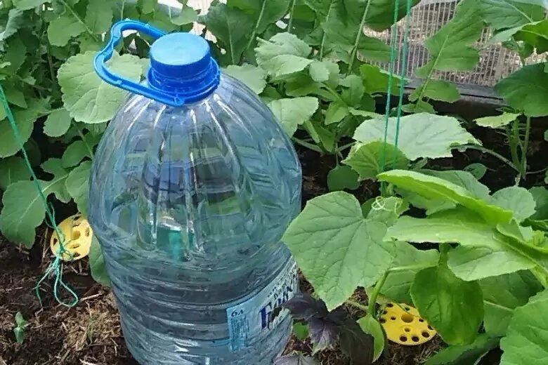 Пятилитровой емкости будет вполне достаточно для открытых грядок и тепличных посадок. Если на улице стоит невыносимая жара, но нет возможности поливать огород ежедневно, поможет пятилитровая емкость для воды. Для начала между растениями нужно выкопать небольшую ямку. Затем в пятилитровой канистре из-под питьевой воды нужно проткнуть несколько отверстий в тех местах, которые будут расположены ближе к растениям. Подготовленную канистру нужно наполнить водой для полива. Важный момент: крышку на ее горлышке необходимо плотно закрутить, иначе вода сразу выльется. После этого канистра с водой днищем опускается в подготовленную ямку и обкладывается небольшим количеством сухой травы или сена. Трава выкладывается вокруг бутылки таким образом, чтобы проколотые отверстия не забились, и присыпается сверху землей. Теперь в ближайшие два дня автополив растениям обеспечен! Ранее мы рассказывали о том, что: