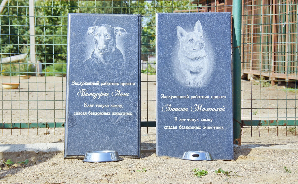 Восемь лет она служила верой и правдой! После того, как ее не стало, появился первый памятник в нашем приюте. На мраморной плите с ее изображением вы можете прочитать такие слова: Пимидорка Лёля - заслуженный работник приюта, восемь лет тянула лямку, спасая бездомных животных! »