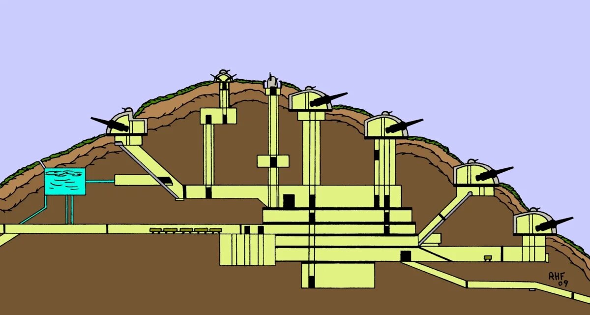 Понятно, что все ДОТы с амбразурами фронтального огня — это вчерашний день. Они могут быть использованы лишь как вспомогательные. Основными должны стать ДОТы огня фланкирующего, в нашей терминологии — капониры и полукапониры. Ну и, как стало понятно, ещё до Первой Мировой, нужны бронированные башни, в которых размещать пушечное вооружение, вплоть до восьмидюймовых орудий. Сочетании башен с тяжёлой артиллерией и лёгких, вооружённых пулемётами и противотанковыми пушками, должно ещё и предусматривать возможность ведение обороны на всех направления, вплоть до удара противника с тыла.