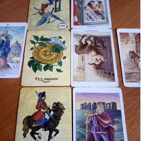 В расклад для Львов пришло три рыцаря. Причем 2 из них пиковые, один из которых оказался в перевернутом положении. Это значит, что вам на этой неделе будет подвластна не только ваша огненная стихия, но и воздушная. Смотрим, как это отыгрывается в самом раскладе. Начало недели Карта на позицию – старший аркан Верховный жрец В понедельник многие Львы посвятят общению с умудренным жизнью человеком – возможно, это учитель или ваш духовный наставник. Он поможет вам морально преодолеть возникшие на пути трудности и препятствия. А кто-то изо Львов уже и сам настолько компетентен в таких вопросах, что готов передать накопленный опыт другим. Дела, работа, бизнес Основная карта – старший аркан Смерть в перевернутом положении Дополняющая – Восьмерка пентаклей У Львов дела на этой неделе идут по инерции. Вы испытываете усталость, порой сонливость. Поэтому действуете бездумно и не способны организовать свои дела. Это мешает воплощению планов в реальность. Со стороны даже будет казаться, что вы сейч