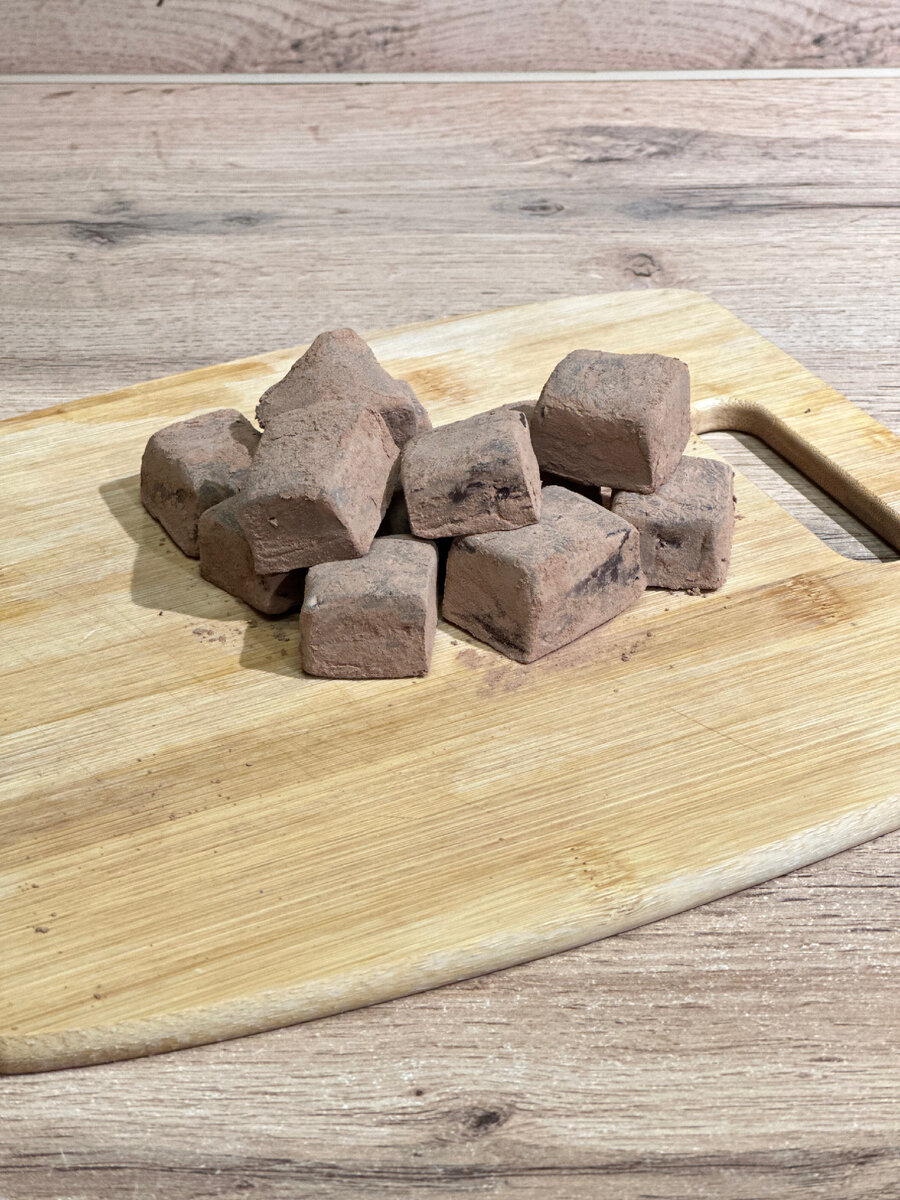 Готовим: 1. В небольшом сотейнике нагреваем ( не до кипения) сгущеное молоко, через пару минут оно станет более жидким. 2. Порциями добавляем какао порошок, хорошо перемешивая каждую порцию. Крайнюю порцию какао уже нужно замешивать ложкой. 3. Перекладываем получившееся шоколадное тесто на пищевую пленку, заворачиваем и немного раскатываем. Убираем минимум на пару часов в холодильник. 4. Нарезаем по форме трюфелей (можно скатать каждый трюфель в кружок) и обваливаем в какао порошке. Ингредиенты: на каждые 300гр сгущенки 60гр какао порошка. Также понадобиться какао порошок для формирования трюфелей
