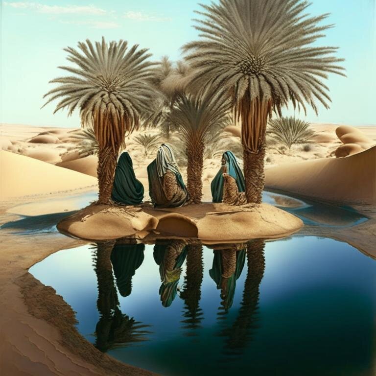 Идут идут и видят оазис. Ну безрукий туда ныряет. Вылазит и видит, что у него руки выросли. Говорит остальным что он волшебный и сразу за ним туда нырнул слепой. Вылазит и говорит:
