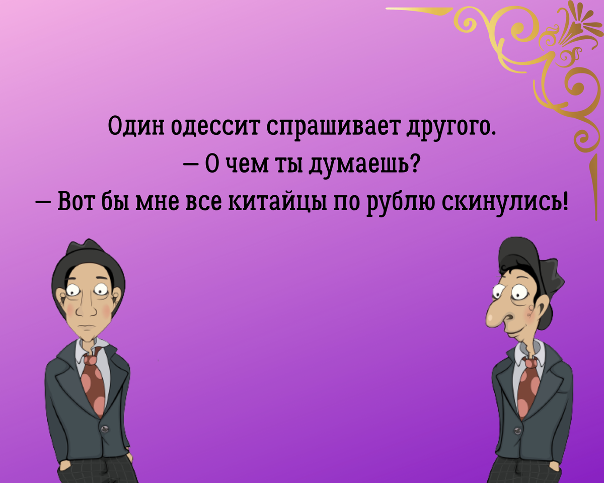 И снова с вами Говорим обо всем. Здравствуйте. У вас есть мечта? Думаю, ответили утвердительно. Некоторые мечты появляются в детстве, о чем-то начинаем думать, встав взрослыми. Но всегда надеемся, что задуманное непременно исполнится. Каждый одессит всю жизнь мечтает услышать два заветных слова: «Я угощаю!» Тема гостеприимства в одесском юморе — это отдельная история. Несколько эпизодов из этого сюжета. — Роза Марковна, вы готовы с Семой идти сегодня вечером в гости к Абраму Моисеевичу? — Конечно, готовы. Семочка сегодня днем уже два раза падал в голодный обморок. Абрам после ухода гостей: — Циля, ты заметила, твой любимый племянник Изя, между прочим, жрал не просто с аппетитом за трех дурных, но и с радостью на лицо. Он вообще с детства имеет манеру неделю сидеть на диете, прежде чем пойти в гости. Все знают пословицу «Копейка рубль бережет». Иногда она бывает очень точна и нужна. Бережливостью одесситов можно тихо восхищаться. — Сарочка, какая ты у меня экономная! — Шо такое, Додик?