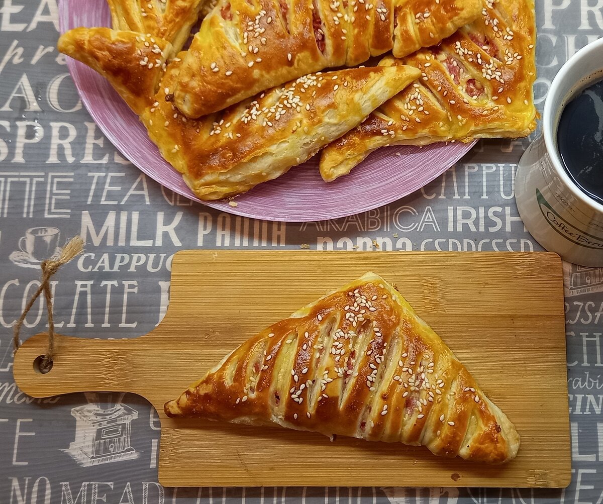 горсть кунжута Начинаем с теста: размораживаем, разделяем на пласты и режем каждый пласт на квадраты. Квадраты раскатываем толщиной 0,5 см. Занимаемся начинкой: трем на терке колбасу\сыр. Отдельно взбиваем в миске яйцо вилкой. А теперь простая хозяйская магия. На одну часть квадрата выкладываем начинку, другую режем диагонально. Защипываем края и смазываем яйцом. Отправляем на противень с пекарской бумагой. Посыпаем кунжутом и отправляем в духовку при 180 градусах на 15 минут. Как только наблюдаете красивейшую корочку на слойках, а дома - аромат, как в лучшей пекарне, вытаскивайте и дайте чуть остыть. Хотя, признаться, горячими с пылу-с-жару еще вкуснее. Люсьен оценил и пытался утащить лак