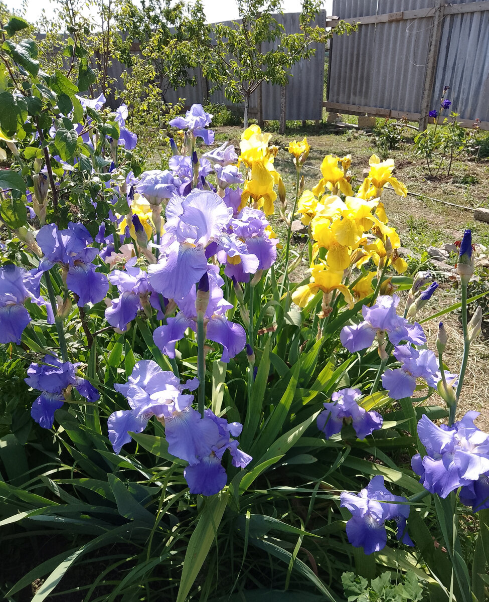 А я так увлеклась ирисами, что забыла её сфотографировать. Эти самые ирисы были когда то для меня мечтой недостижимой, а теперь сад наполнен их ароматом. В течении дня с перемещением солнца и выглядят они по разному. За три года хорошо так разрослись, а покупала их по одному корешку, но чтобы были разных расцветок. Вот этот, тёмно фиолетовый на фото выглядит гораздо светлее. Два года он сидел не показывая своих цветков и вот решил наконец открыться солнцу и нам. А этот розовый оказался не такой вредный. Его посадила прошлой весной. Этот среднего размера, он у нас новенький. Забрала последний у бабулечки-божьего одуванчика на рынке. Эти два цвета растут в палисаднике под окном. Этот пучок разросся под сливой. Вот ещё один новенький. Посадила его вчера вечером под присмотром Ипкинса. И ещё один, белый с оранжевой бородкой. На фото он несколько помятый, но это потому, что цветок огромный и тяжёлый, ехал в новый дом из города. Вот тоже из новеньких. При посадке как бы надо обрезать цвето