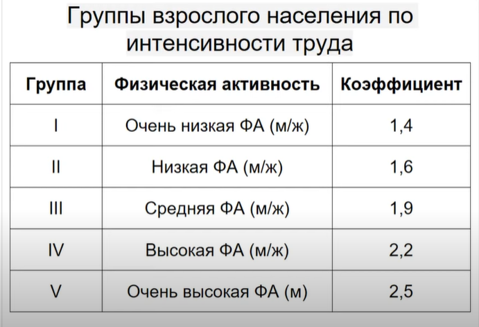 Если вы занимаетесь интеллектуальной деятельностью, то вы в первой группе, в последней - только мужчины очень тяжелого труда. Плюс питание должно соответствовать региону - на севере на 10% выше, на юге - на 5% ниже - по сравнению с умеренным климатом.