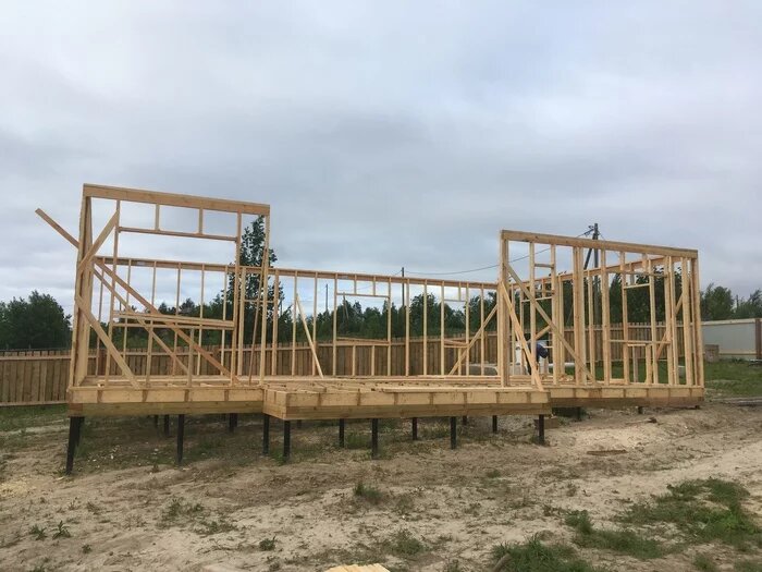 Собираем наружные стены. Они 100мм, поэтому легче на порядок и работа идет быстро. Собираем аналогичные внутренние стены и соединяем их перемычками. тут можно использовать фанеру или осб. Мы взяли доску - она была доступнее на тот момент. Доску мы используем, сырую, естественной влажности. (потому что на рынке продается 17% влажность, а она еще высыхает в каркасе до 8-12% и даже из сухой, получаются щели. По уму лучшая доска из вакуумной сушильной камеры, которую высушили до мебельной влажности 8%