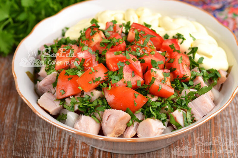 Один из моих любимых салатов. В нем небольшое количество продуктов, но они настолько хорошо сочетаются между собой, что в итоге получается невероятно вкусный салат. В нем есть сочность, легкий хруст, замечательный аромат и вкус. Готовится он легко и быстро, буквально за 10 минут. Порции 5-6 Время приготовления 10 минут Ингредиенты Инструкции 1. Для приготовления беру куриный копченой окорочок (вес 500 гр.), его можно заменить и на копченую куриную грудку. Разделываем окорочок на филе и нарезаем на средние кубики (получается 250 г). 2. Помидоры нарезаем на средние кубики и отправляем в салатник. Они дают сочность салату. 3. Репчатый лук нарезаем не очень мелкими кубиками и добавляем к помидорам. Лук дает легкий хруст, сочность и остроту. 4. Выкладываем копченое филе. 5. Дополняем все мелко нарезанной петрушкой и майонезом. Немного солим. Используем именно петрушку, укроп здесь не подойдет. 6. Салат перемешиваем и сразу подаем на стол. Сочные помидоры выделяют много сока. Он перемешива