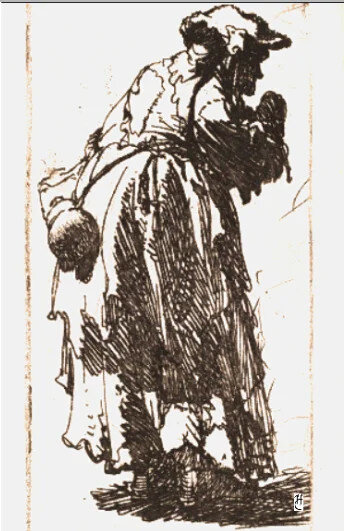 Одета всегда в кучу лохмотьев: это куча каких-то юбок и платков, подвязанных поверх юбок, из под них видны старые калоши или дырявые ботинки, вернее то, что много лет назад было ботинками. Бесчисленное множество каких-то кофт, тоже неопределенного цвета. На голове даже летом шапка, поверх старая ветхая шаль, концы которой перекрещены на груди и завязаны узлом на спине.