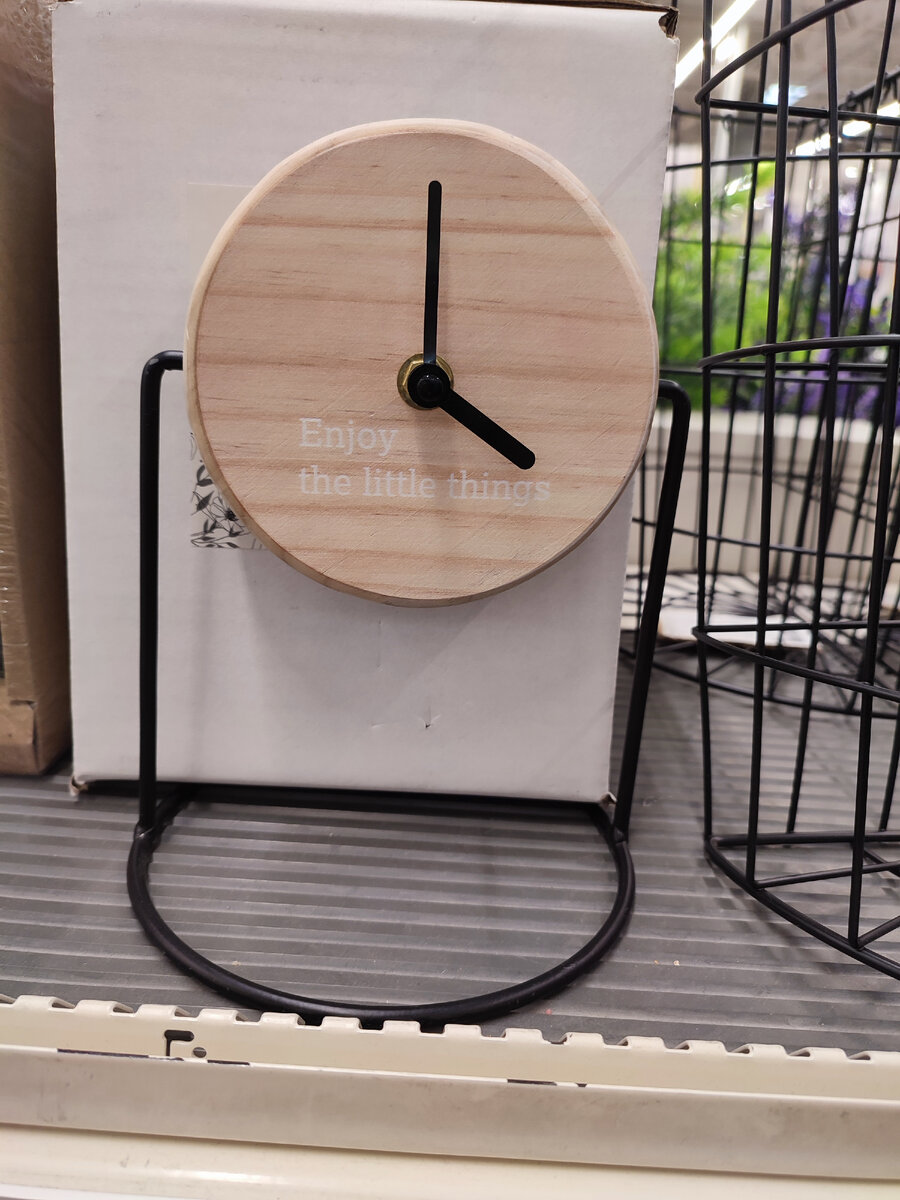 Как-то мы давно уже привыкли к большим магазинам, где можно купить все - от лампочки до мебели... поэтому, как только что-то нужно для дома, мы сразу вспоминаем про Леруа Мерлен. А когда начинаете ремонт, то этот магазин просто палочка-выручалочка... вот и мы погрязли в ремонте. Бюджет ограничен, а хочется хорошо и красиво)) поэтому в Леруа мы частые гости. Писать про гвозди, сифоны, переходники, шпателя и прочее не хочется, а вот про красивое сегодня расскажу.)) Часики) Часами я их назвать не могу, ведь их диаметр всего 12 см... Впрочем, об этом честно написано на самих часах, по-английски - наслаждайся маленькими вещами.) Часики изготовлены из цельного куска дерева, стоят на металлической подставке. Смотрятся стильно, подойдут для интерьера в стиле лофт. Они, конечно же, работают... но вот как-то без цифр непривычно. Это, скорее, интерьерная вещица, нежели функциональная. Цена 590 рублей. Скажем так, вполне терпимо. Коврик. Какие только коврики, ковры и дорожки не представлены в Леру