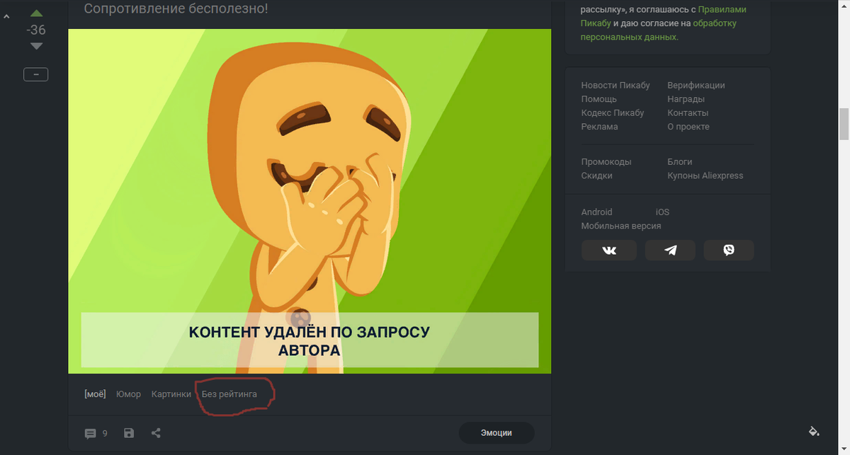 Тут гораздо всё проще, надо успеть пока 24 часа не прошло с момента публикаций. Выложил вчера шутку про сопротивление, но никто не оценил. Пост ушел в минус. До этого рейтинг был 1025. После поста упал до 985, продолжал падать. Не спешите скрывать! Удалить к сожалению невозможно, только через службу поддержки, но это не вернет рейтинг. Можно сделать проще. Поставить тег "Без рейтинга". И всё) Команда пикабу вам об этом не расскажет, он порекомендует скрыть. После этого тега рейтинг вернулся на 1025, как было до этого. Когда вы этот тег поставите, то рейтинг вернется на прежний уровень, но и рейтинг не будет с поста начисляться. Настоящее спасение когда он уходит в минус. Кто попробует, напишите.