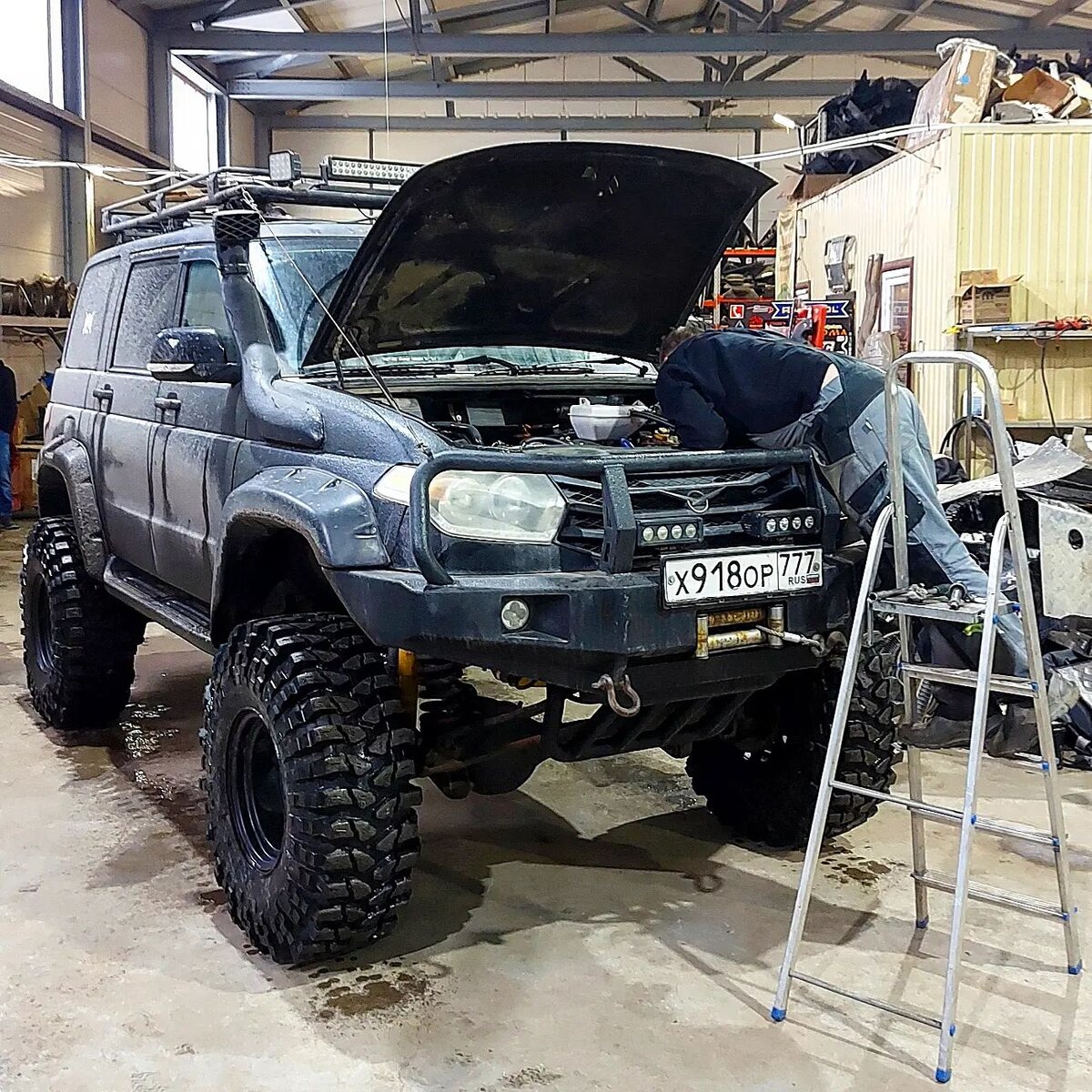 Именно такой УАЗ Патриот посетил как-то раз мастерскую 4х4ok. Для того, чтобы проинспектировать содержимое его подкапотного пространства и произвести ремонтные работы специалистам ателье пришлось вооружиться стремянкой и, скажем честно, проявить недюжинные акробатические способности – настолько высоко от земли находится моторный отсек этого отечественного гиганта. К слову, в его арках установлены самые экстремальные шины из нашей линейки моделей для бездорожья – M9060 MUD TREPADOR в размерности 38.5x12.50-16. Что, безусловно, также добавило ульяновскому внедорожнику роста. 💪