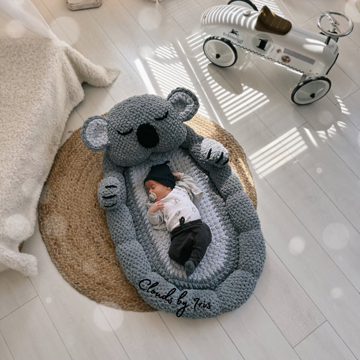 Ну что, как и обещала, рассказываю подробнее о коконе. Вяжется он из пряжи с готовыми петлями Alize Puffy поэтому получается очень мягкий и нежный 😍 Чем же удобен кокон? 🤔 Я часто работаю на полу, кладу Тимура рядом в кокон и мне удобно, что он всегда в поле зрения и мне не надо бегать к нему и проверять не проснулся ли он. Когда оставляю одного на большой кровати, так же кладу в кокон и не переживаю, что он может во сне подвинуться к краю и не дай бог упасть 🙈 он у меня в 2 месяца может спокойно сантиметров на 20 передвигаться по кровати. Так как он с рождения привык к кокону, в своей кроватке он тоже спит в нем, чтобы ему было комфортнее, так как он уже чувствует что-то знакомое. Ну и получается, что где бы он ни был, благодаря кокону малыш чувствует себя как дома 🥰 и спит спокойно. Немного сухих цифр 🤭 Расход: 🐨 Alize Puffy темно-серого цвета - 16 моточков 🐨Alize Puffy светло-серого цвета - 2 моточка 🐨 Alize Puffy черного цвета совсем немного на носик, глазки и ног