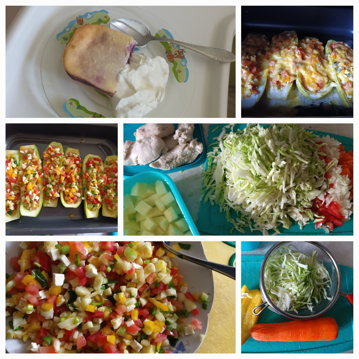 Сегодня детское меню, да и наше тоже такое. На завтрак делала творожную запеканку с чёрной смородиной и сметаной. Ещё чай и бутерброд с плавленый сыром. Запеканки вообще делаю не часто, дети их жуют плохо. Я делаю просто. Творог не перетираю, отдельно ничего не взбиваю. Все ингредиенты, кроме смородины всыпаем в чашу и взбиваю блендером. Примерно половину творожной массы выложить в форму для запекания, смазанную сливочным маслом форму, сверху смородину и выливаем оставшуюся массу сверху. Выпекать творожную запеканку в разогретой до 180°С духовке в течение 40 – 45 минут до легкого зарумянивания. На обед у нас были щи. В предварительно сваренный бульон всыпаю картофель, капусту, лук, морковь и у меня ещё помидор. Всё добавляю вместе, не пережаривая. Добавляю перец и лаврушку. Из остатков капусты, моркови и перца сделала ещё салат на ужин. Немного поселилась, добавила сахара и перетерла руками, заправка растительным маслом. К салату у нас лодочки из кабачков Кабачки разрезаем попол