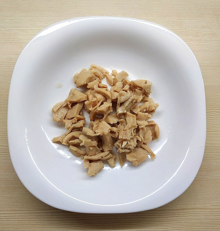 Когда надо быстро, вкусно и полезно. Салат с кальмарами — настоящая находка для тех, кто хочет похудеть. Главная особенность кальмара в том, что в нём содержится много белка (а именно он важен для энергии и жизнеспособности организма). Но при этом моллюск низкокалорийный. Вот наш кальмар из баночки — всего 105 ккал. И хотя его в консервной банке немного — всего лишь 100 г, но в сочетании с другими продуктами салата получается очень много. Тарелка продуктов Почему "Всё по 100"? Мы в равной доле, т.е. по 100 г берём все продукты и смешиваем их. Итак, нам нужно: Это основные продукты, которые влияют на общую калорийность салата. На выходе мы получаем аж полкило салата общей калорийностью 395 ккал. Снизить этот показатель можно, если брать не целые яйца, а только белок. Ведь вареные белки имеют показатель калорийности всего лишь 42 ккал. Я не учитываю в калорийность дополнительные ингредиенты: Если Вы съедите всю порцию за один раз, то обеспечите себя энергией на полдня точно. Концент