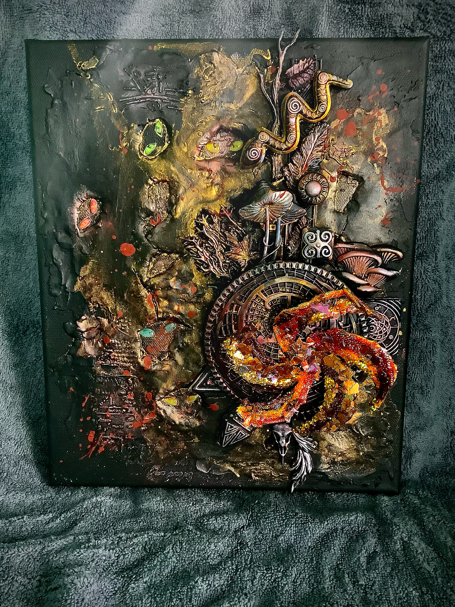 Немного эксклюзивчика, который увидит мир не раньше июня. Но здесь можно. По мотивам своей повести "Мы — Tanzwut. Львиное сердце" я сделала вот такое... эээ... панно? В первый раз пробовала подобную работу, осталась довольна результатом. «Из сумки вынимались камни разных цветов и размеров. На свет показались засушенные и живые растения. Зазвенели баночки и колбочки, наполненные жидкостью, порошками и даже клубящимся газом. Красящей золотой смесью на земле был нарисован ритуальный круг, внутри расположены магические руны. Предметы разложены в закономерном еле уловимом порядке. Демоны начертили на своих телах узоры, являющиеся частью обряда. Семеро встали на границах круга на равном расстоянии друг от друга, начали что-то шептать в унисон. Из земли выросла огромная крутящаяся воронка. Поднялся жуткий ветер, тут же загудевший в темных кронах закатных деревьев. Демоны припали к земле, впившись когтями в почву, чтобы их не сбило порывами. Воронка бешено вертелась, раскачиваясь в разные ст