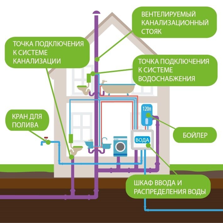 👷♂️ Обе системы – водопроводная и канализационная, разделяются на наружную и внутреннюю. Участки сети в помещении сильно не отличаются от их аналога в квартире, разве что разветвленностью на несколько этажей. Вне дома, как правило, обе сети разво