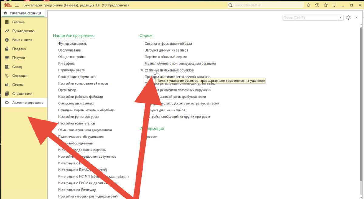 2. В меню "Администрирование " выбрать пункт «Удаление помеченных объектов».