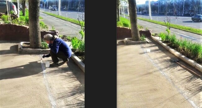 Работы много: убрать отростки цветов, взрыхлить землю... Садовники знают. Кроме этого, у бордюра скапливается мусор. За три дня после уборки столько набралось. На первом этаже продуктовый магазин и летом мусор становится интереснее. Упаковки от всего, что съедается и выпивается, салфетки. Вот бы эти фантики в моё детство. 😊 Когда не было полосы, автомобили парковались впритык к бордюру. Приходилось изворачиваться, чтобы подобраться к цветам. Полить было попроще: с одной стороны машины зайдёшь, потом с другой. Про "подметать" вообще весело. Нет-нет, да задену машину метлой. 🧹Сигнализация! Лет пять писала записки: "Пожалуйста, не ставьте машину впритык к бордюру. Она мешает подметать, ухаживать и поливать цветы." Большинство проникалось. Правда, за зиму забывалось. Но, однажды, смотрела, как наносят разделительные полосы на дороге, и осенило. У водителей есть выработанный рефлекс - не пересекать сплошную. Может и здесь сработает? Нарисовала. И, вуаля! Сигнализация тоже вложила свою л