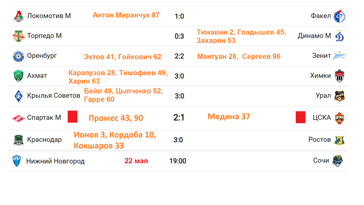 Всем привет. Стало известно, кто в следующем сезоне пополнит чемпионат России . Рассказываю о результатах 28 тура. Локомотив – Факел 1:0. Торпедо – Динамо 0:3. Оренбург – Зенит 2:2. Ахмат – Химки 3:0. Крылья Советов – Урал 3:0. Спартак – ЦСКА 2:1. В первом круге была результативная ничья 2:2. Краснодар – Ростов 3:0. Это третий матч тура с подобным результатом. Краснодар разогнал беспроигрышную серию до 6 матчей (2 ничьи и 4 победы). Нижний Новгород – Сочи сыграют 22 мая. Начало в 19:00. Расписание следующего тура. 27 мая. Химки – Урал. Торпедо – Оренбург. Краснодар – ЦСКА. Сочи – Зенит. 28 мая. Спартак – НН. Динамо – Локомотив. Факел – Крылья Советов. Ростов – Ахмат. Какие изменения в списке лучших бомбардиров и ассистентов?